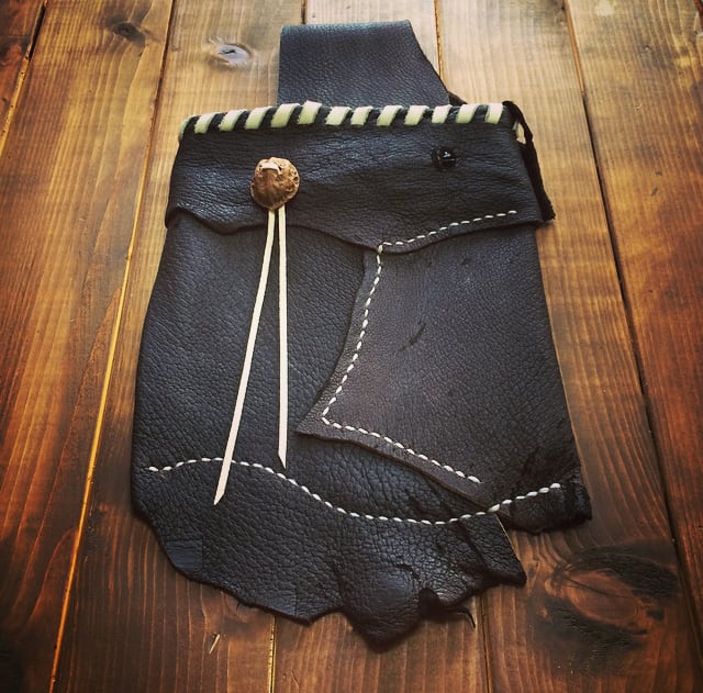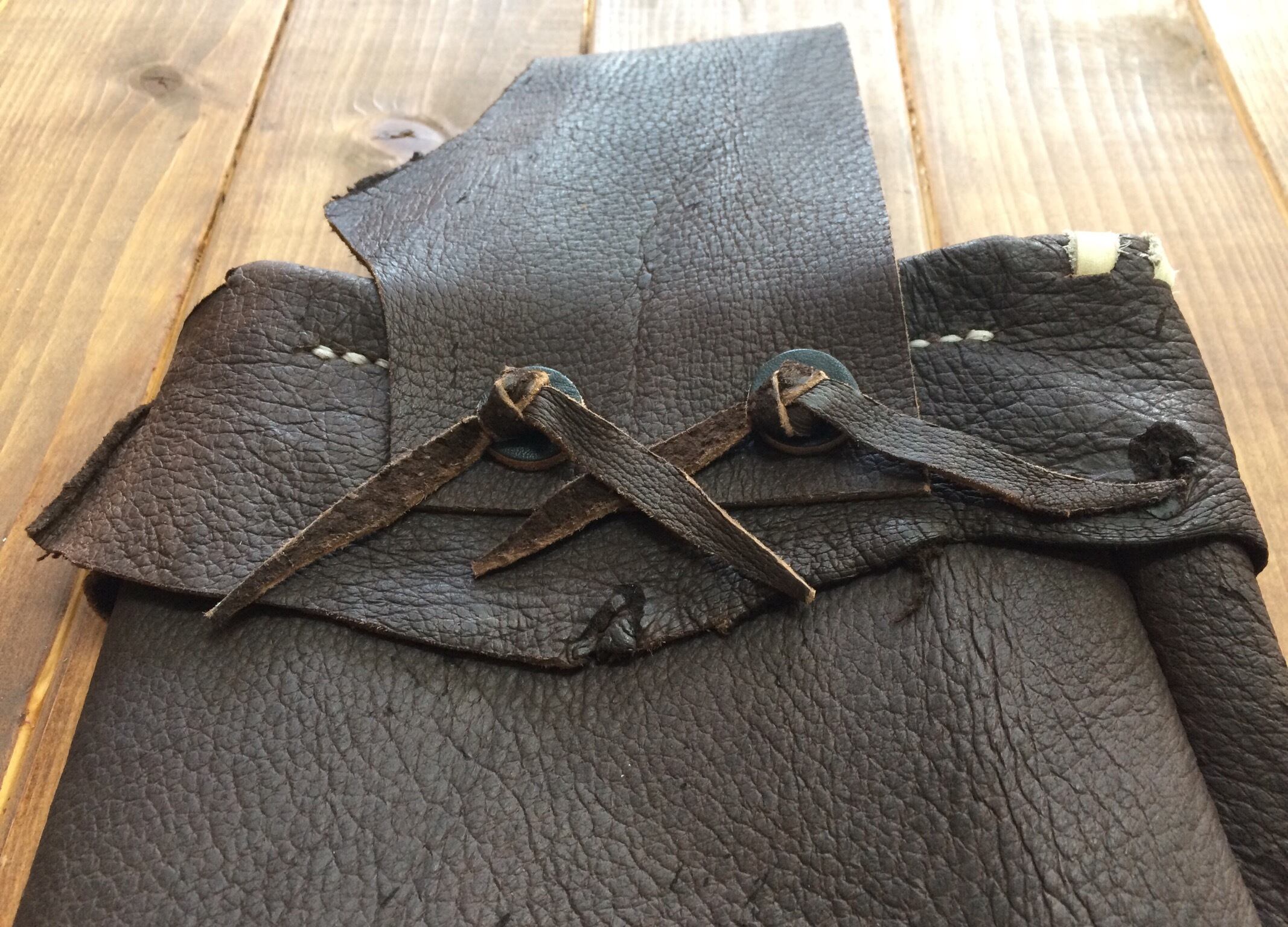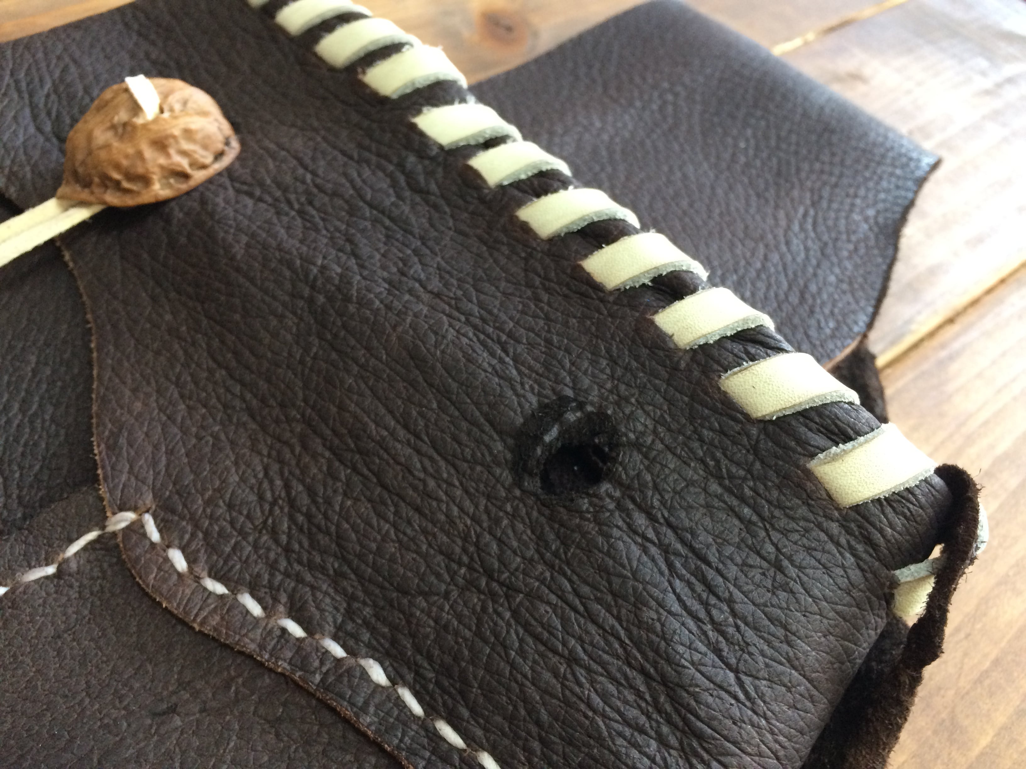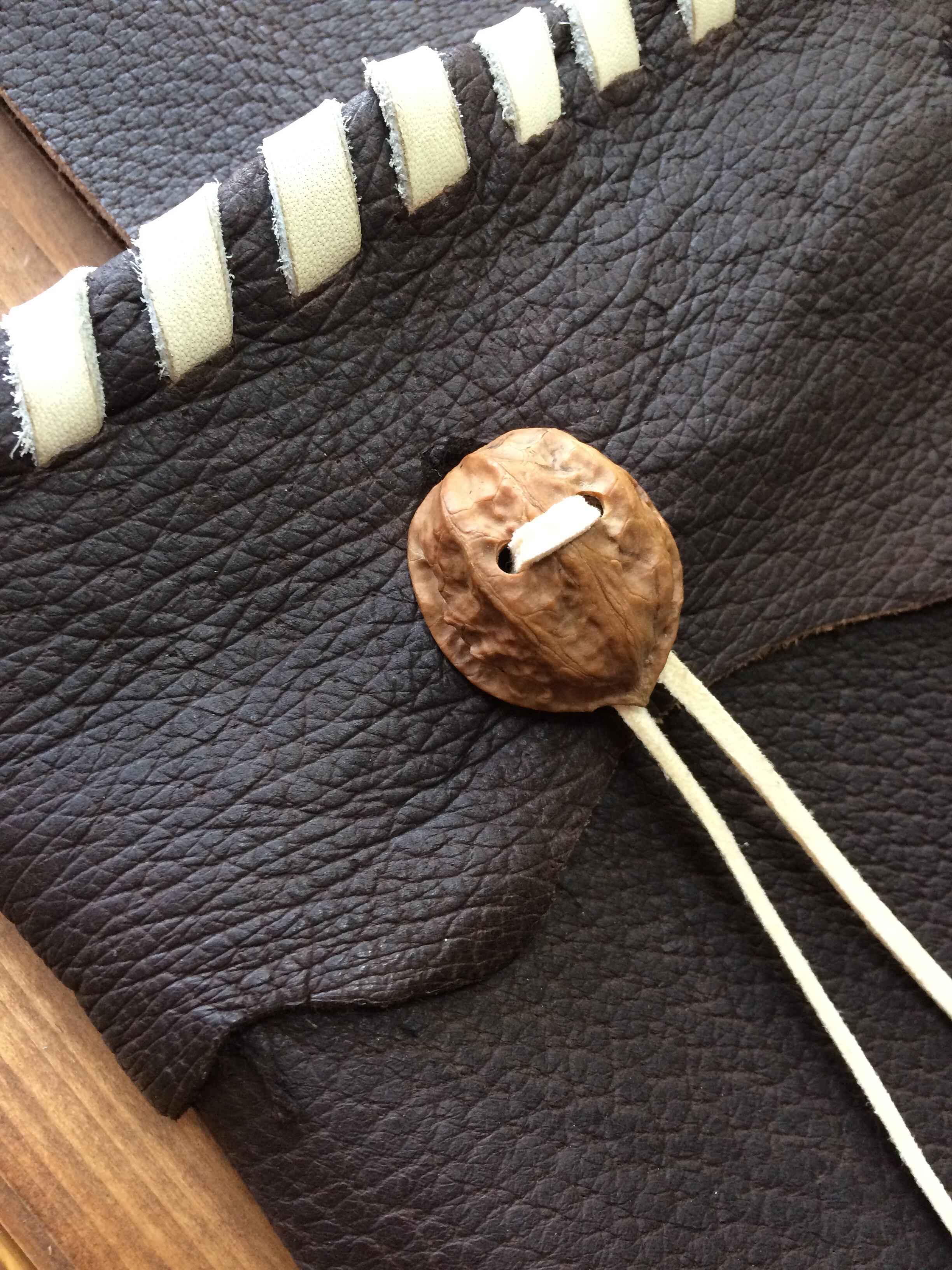 金具を使わずクルミの殻ををアクセントに革の自然で味のある所を生かしオールハンドメイドバッグになります。